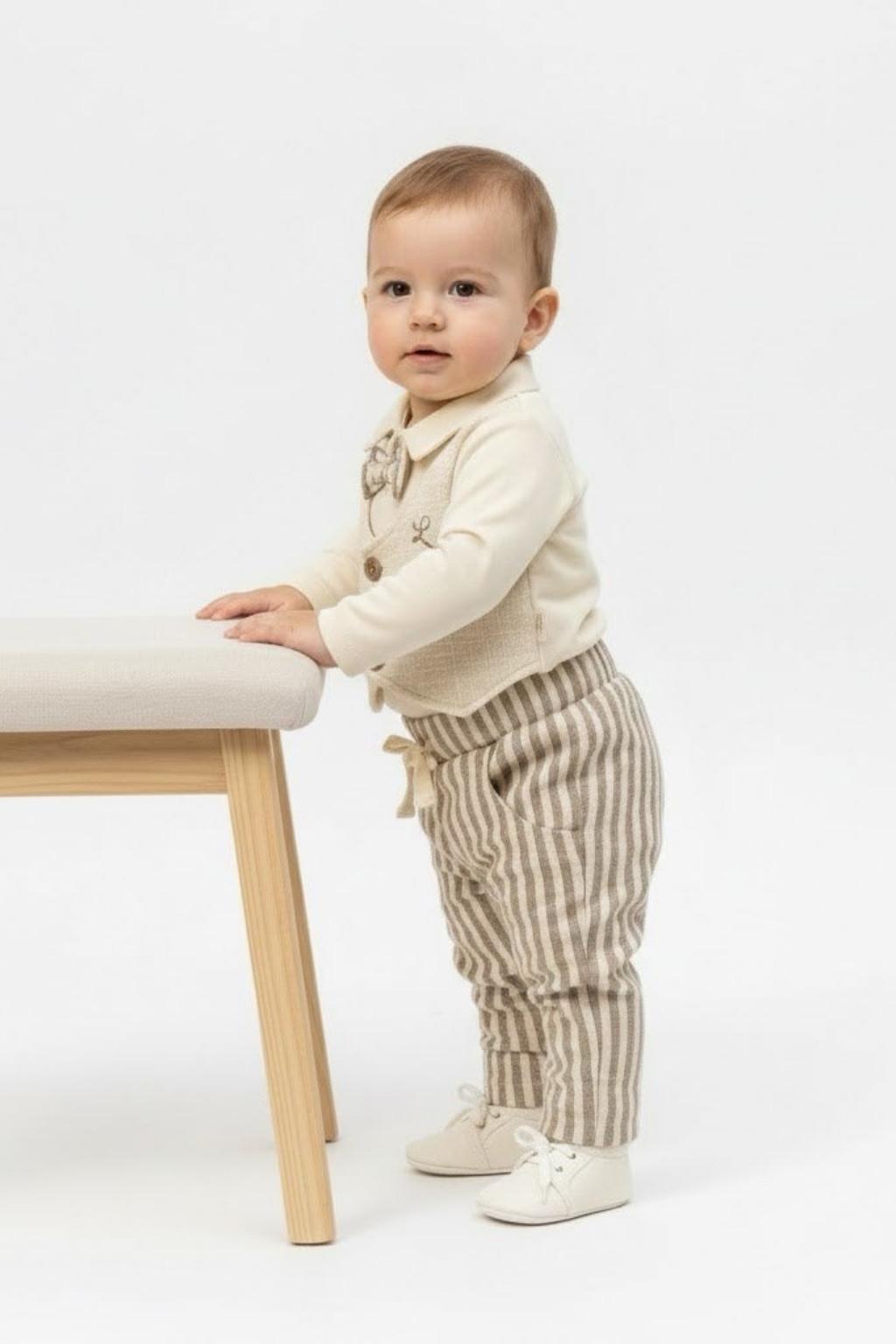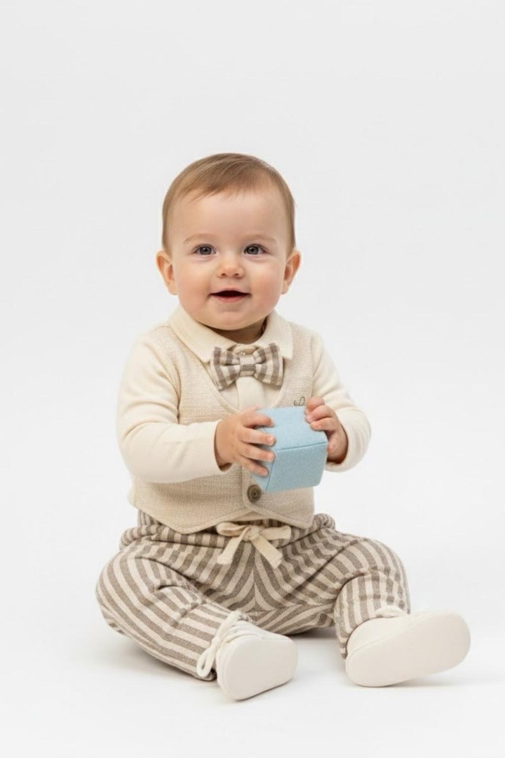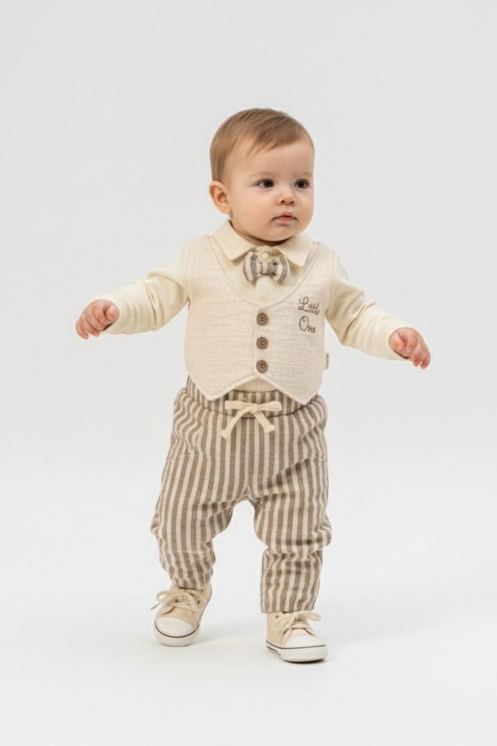 6-18 ay erkek bebekler için tasarlanan bu şık ikili takım; kendinden yelek görünümlü üst ve uyumlu pantolondan oluşur. Papyon detayı ve çizgili pantolon tasarımı sayesinde bayram, doğum günü ve özel davetlerde zarif bir görünüm sunar. Yumuşak dokusu ile bebeğiniz gün boyu rahat eder.