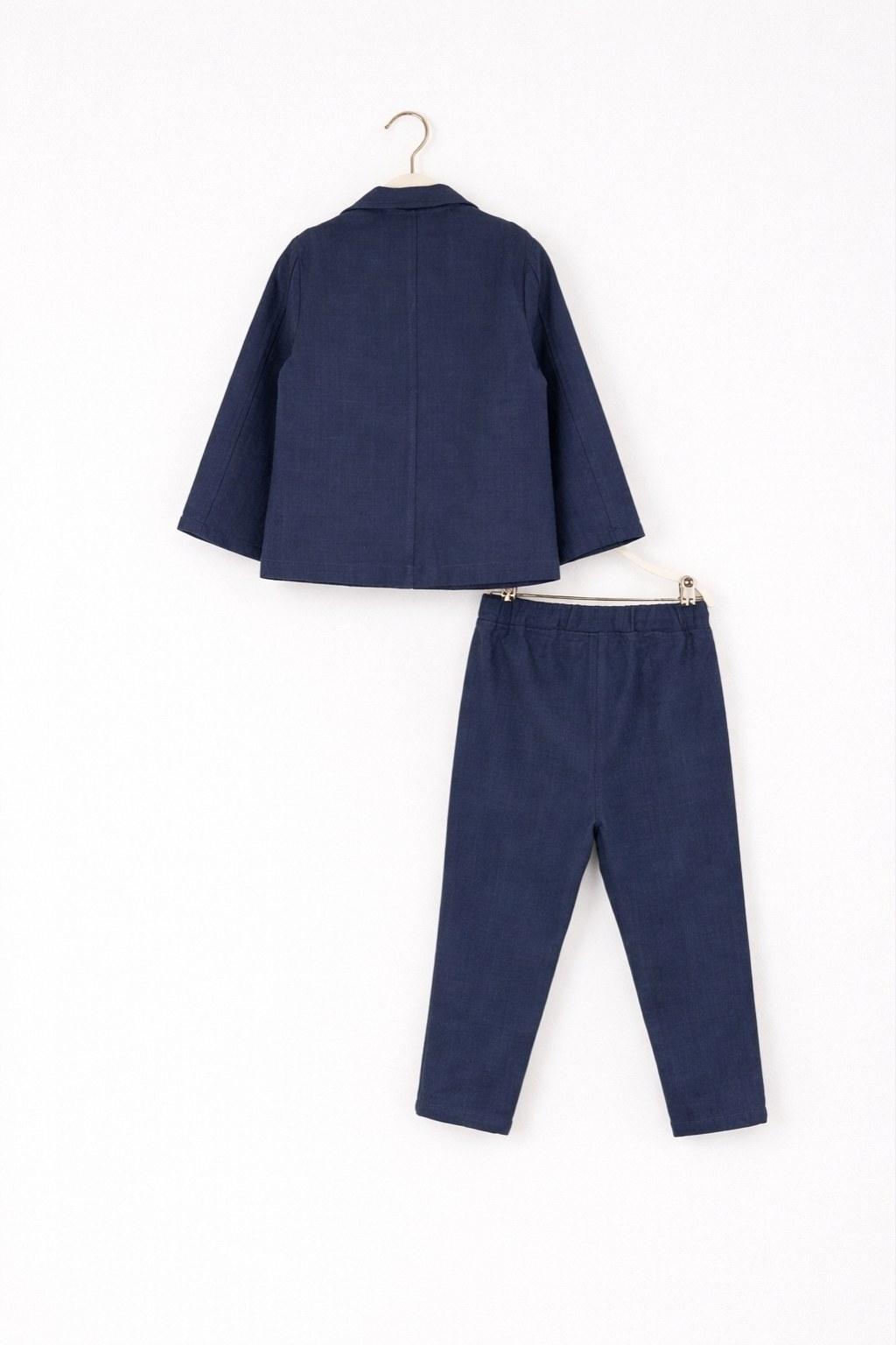 Erkek Bebek Üçlü İndigo Takım, indigo rengiyle şık duran ceket–tişört–şort kombinasyonundan oluşur. %100 pamuklu yapısı sayesinde bebeğin hassas cildine uyum sağlar, nefes alır ve gün boyu konfor sunar. Lastikli bel detayıyla kolay giydirilir; günlük kullanımda da, özel günlerde de modern ve derli toplu bir görünüm sağlar.
