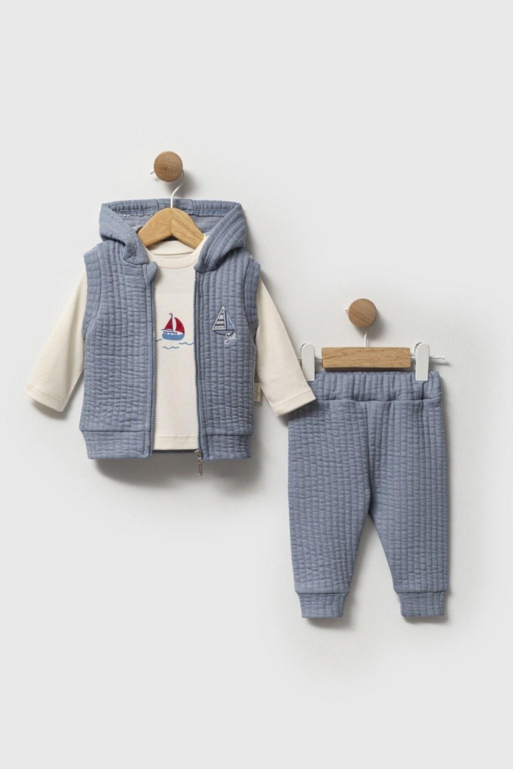Erkek Bebek 3-12 Ay Kapüşonlu Yelekli 3’lü Takım, yumuşak dokulu kumaşı ve şık tasarımıyla miniklere hem konfor hem stil sunar. Kapüşonlu fermuarlı yelek, uzun kollu baskılı body ve lastikli pantolondan oluşan bu takım, günlük kullanım için idealdir.
