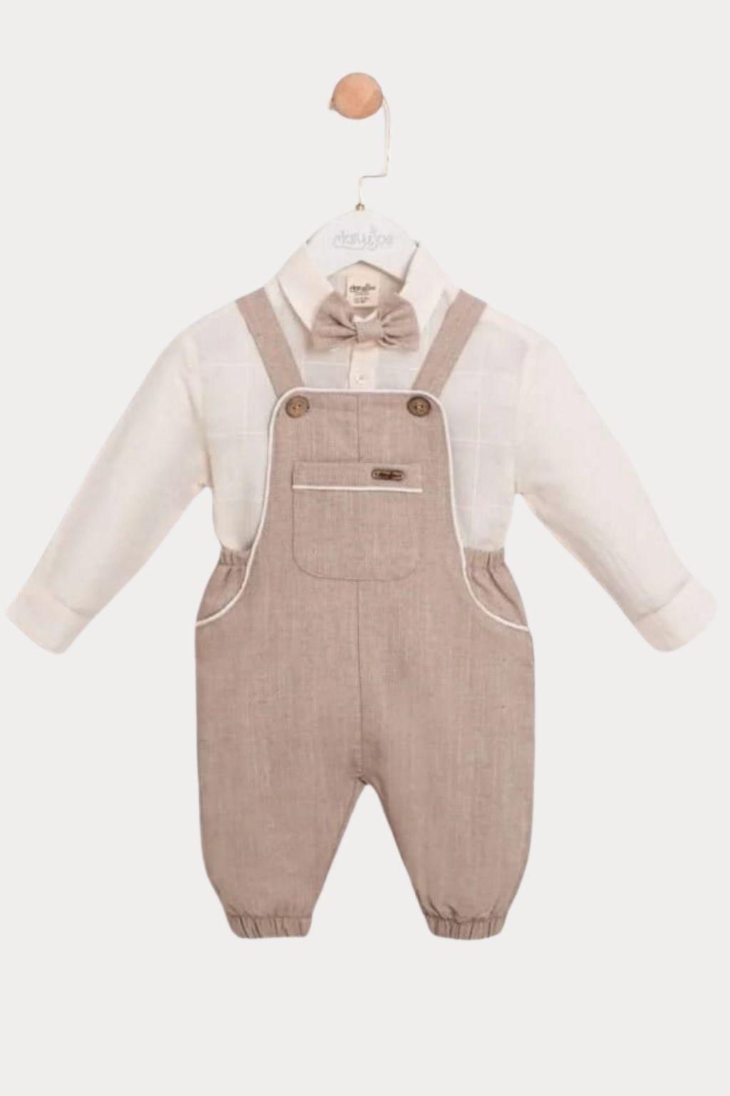 Minik beyefendiler için tasarlanan Erkek Bebek 6-24 Ay İkili Tulum, şıklık ve konforu bir arada sunar. Özel günlerde, doğum günü kutlamalarında ve aile davetlerinde tercih edebileceğiniz bu şık tasarım, bebeğinizin zarif bir görünüm elde etmesini sağlar. Soft bej tonu sayesinde sade ve asil bir stil sunarken, gömlekli tasarımı ve papyon detayı ile klasik bir kombin havası oluşturur. Hafif ve nefes alabilen kumaşı bebeğinizin hassas cildine uyumludur ve gün boyu rahat hareket etmesine yardımcı olur. Pratik düğme kapama sistemi sayesinde kolay giydirilip çıkarılabilir. Esnek yapısı ile bebeğinizin hareket özgürlüğünü kısıtlamaz.