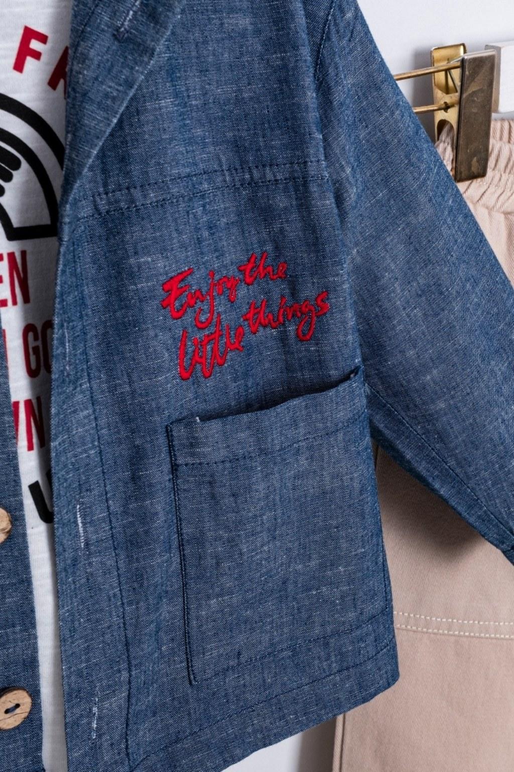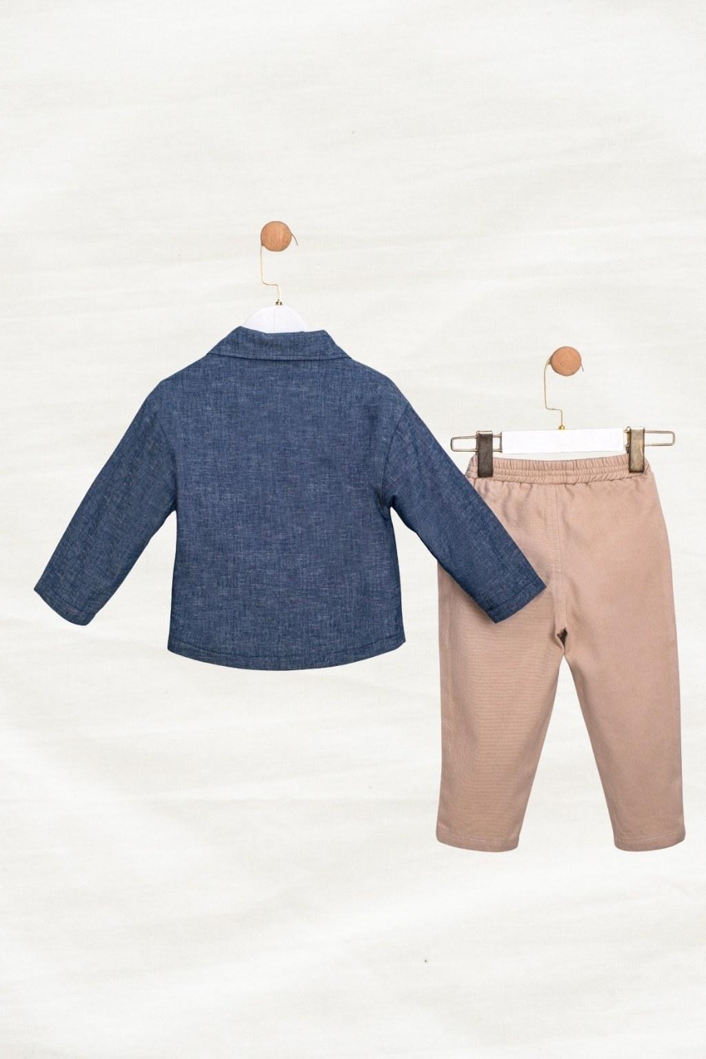 Şıklığı ve rahatlığı bir araya getiren bu 3’lü takım; denim görünümlü gömlek, baskılı tişört ve bej pantolondan oluşur. Günlük kullanım, okul/kreş ve özel gün kombinleri için kurtarıcı bir settir. Pantolonun beli lastikli yapısıyla kolay giyilir, çocukların hareket özgürlüğünü destekler.
