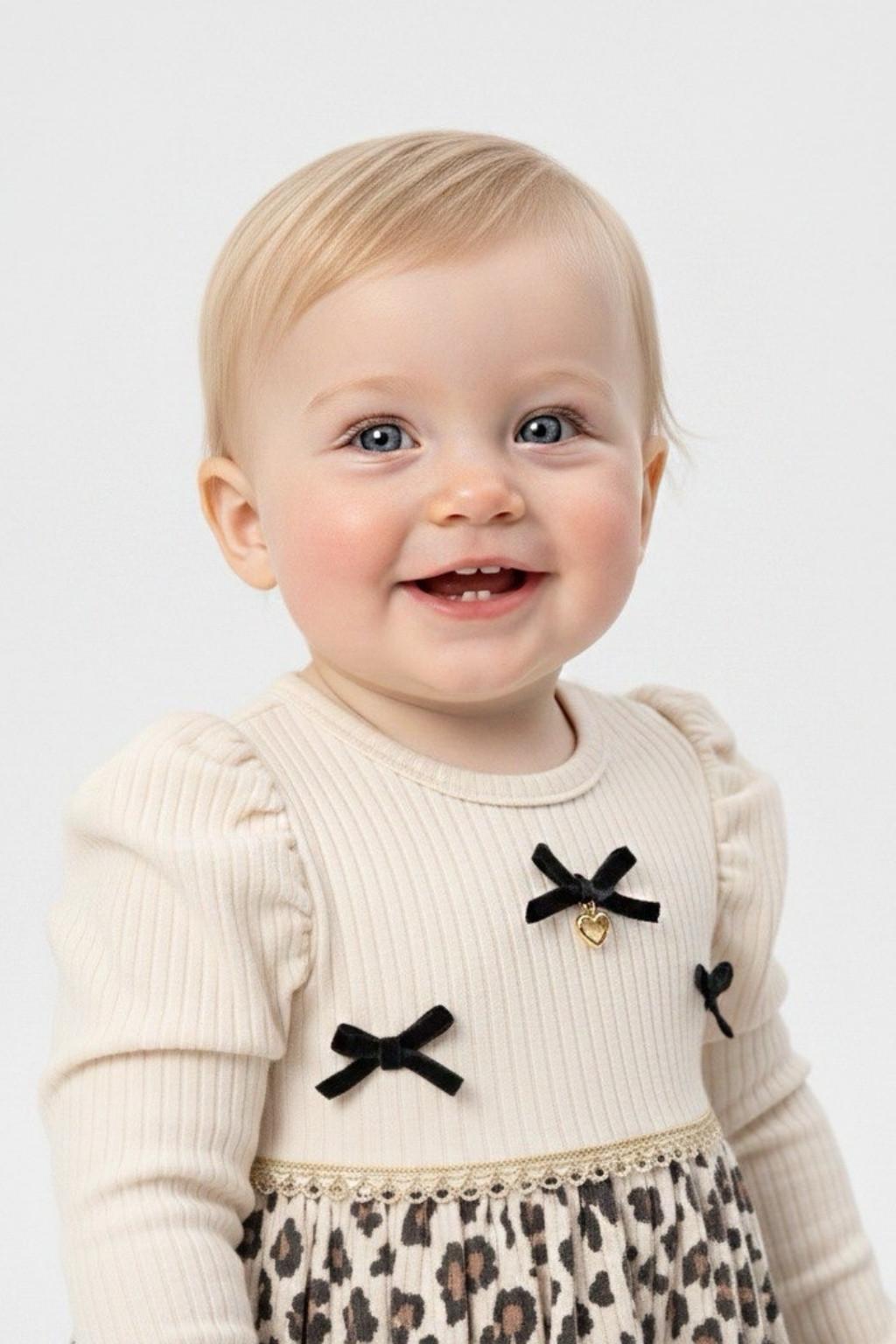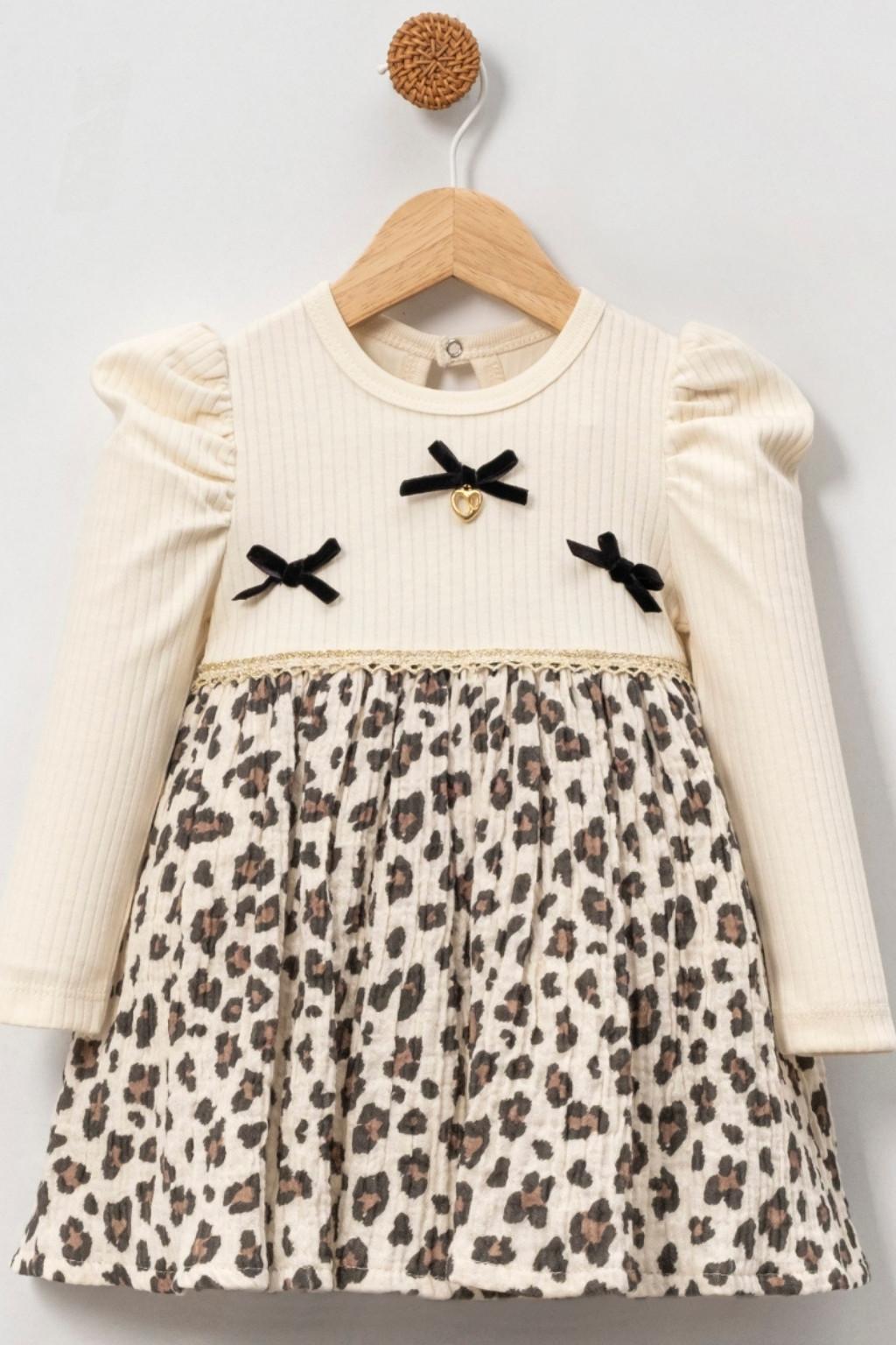 Kız bebekler için tasarlanan bu elbise; üst kısmındaki fitilli kumaşı, balon kol detayı ve leopar desenli eteğiyle şık bir görünüm sunar. Ön yüzündeki fiyonk süslemeleri kombine tatlı bir hava katar. Günlük kullanımda rahat, özel günlerde ise zarif bir tercih olur.