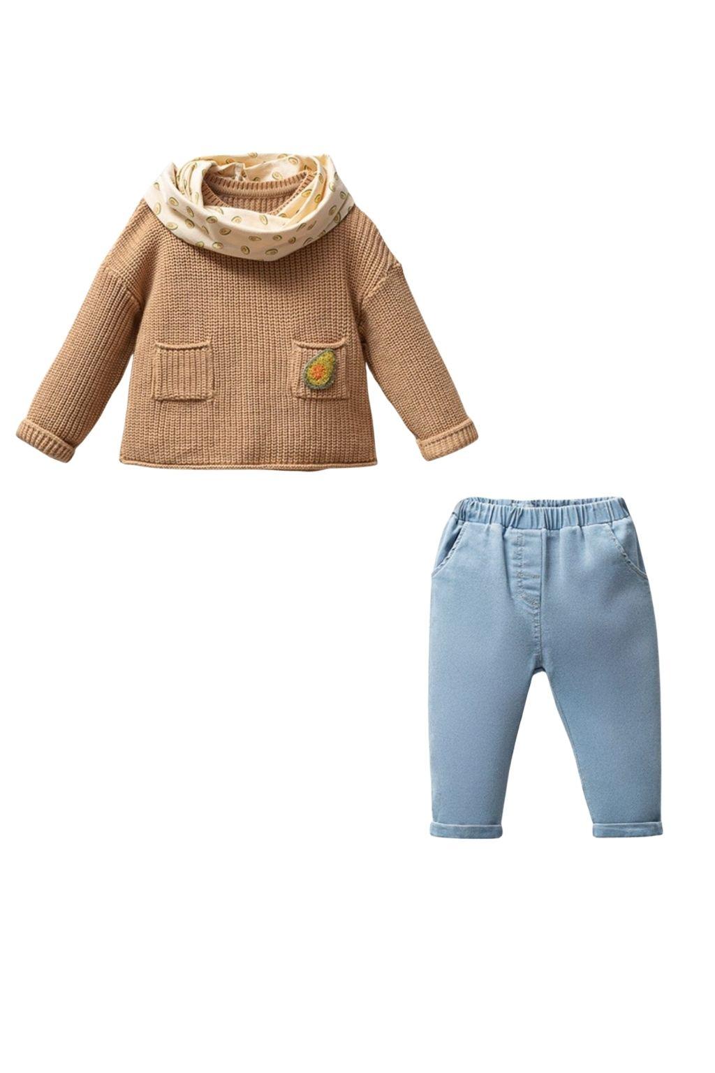 Miniklere hem şık hem de konforlu bir kombin! Yumuşak dokulu triko kazak, sevimli detayları ve desenli fularıyla günlük kullanımda pratik bir stil sunar. Lastikli bel yapısına sahip pantolon rahat hareket etmeyi destekler. Mevsim geçişlerinde ve serin günlerde ideal bir takımdır.