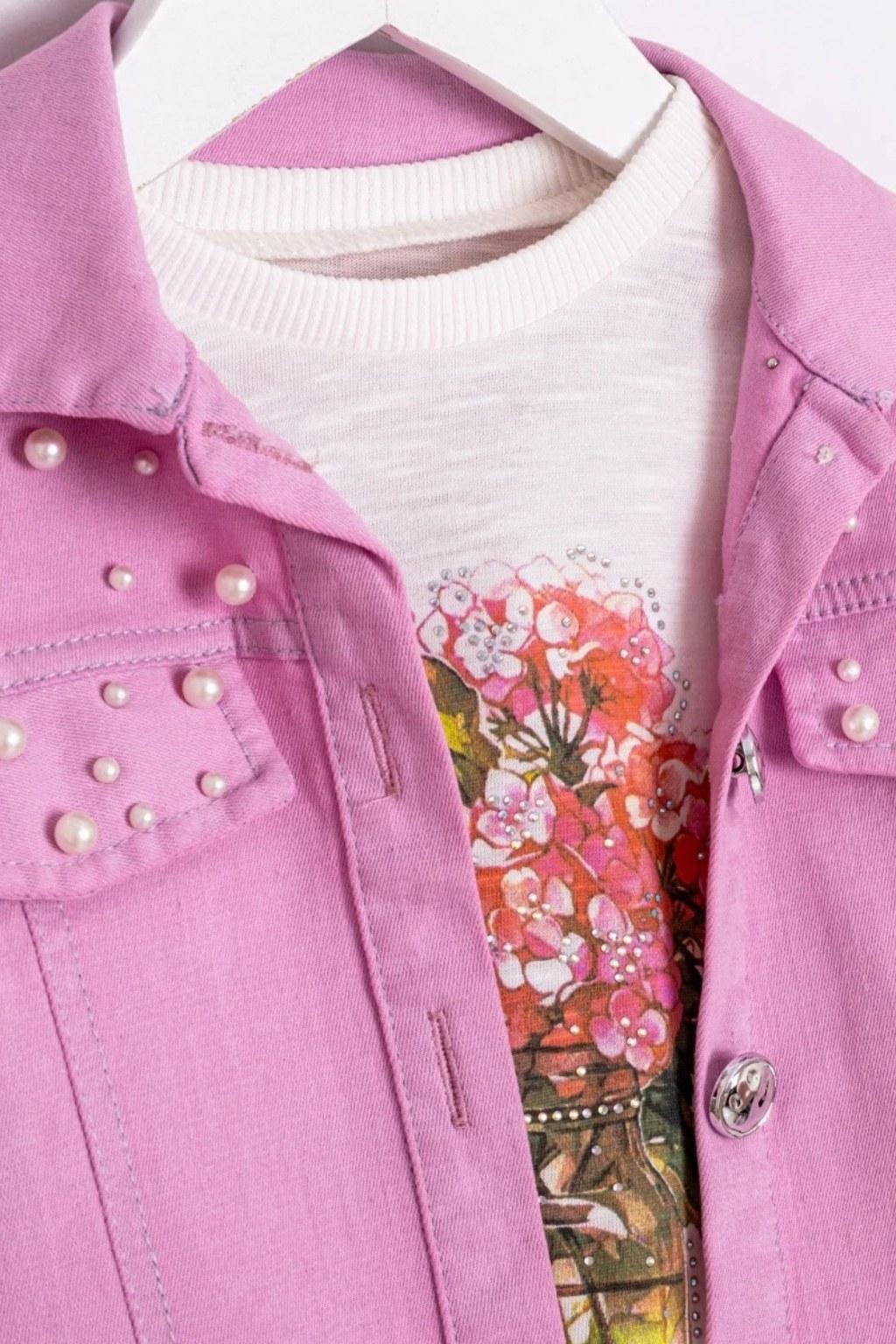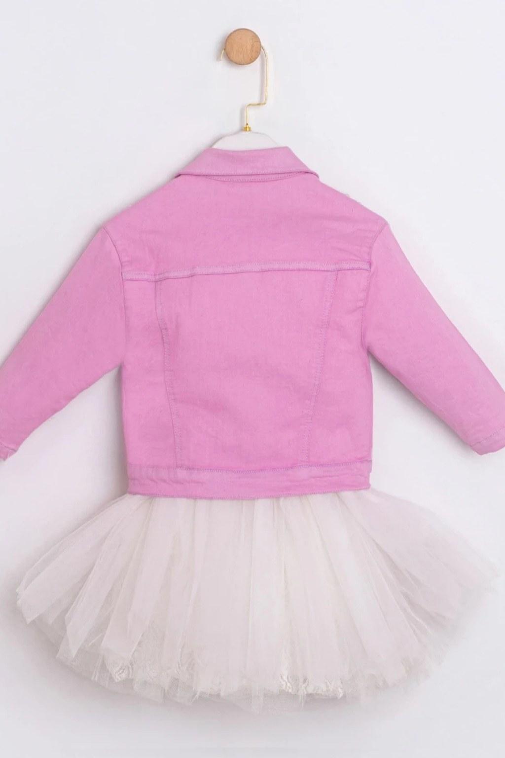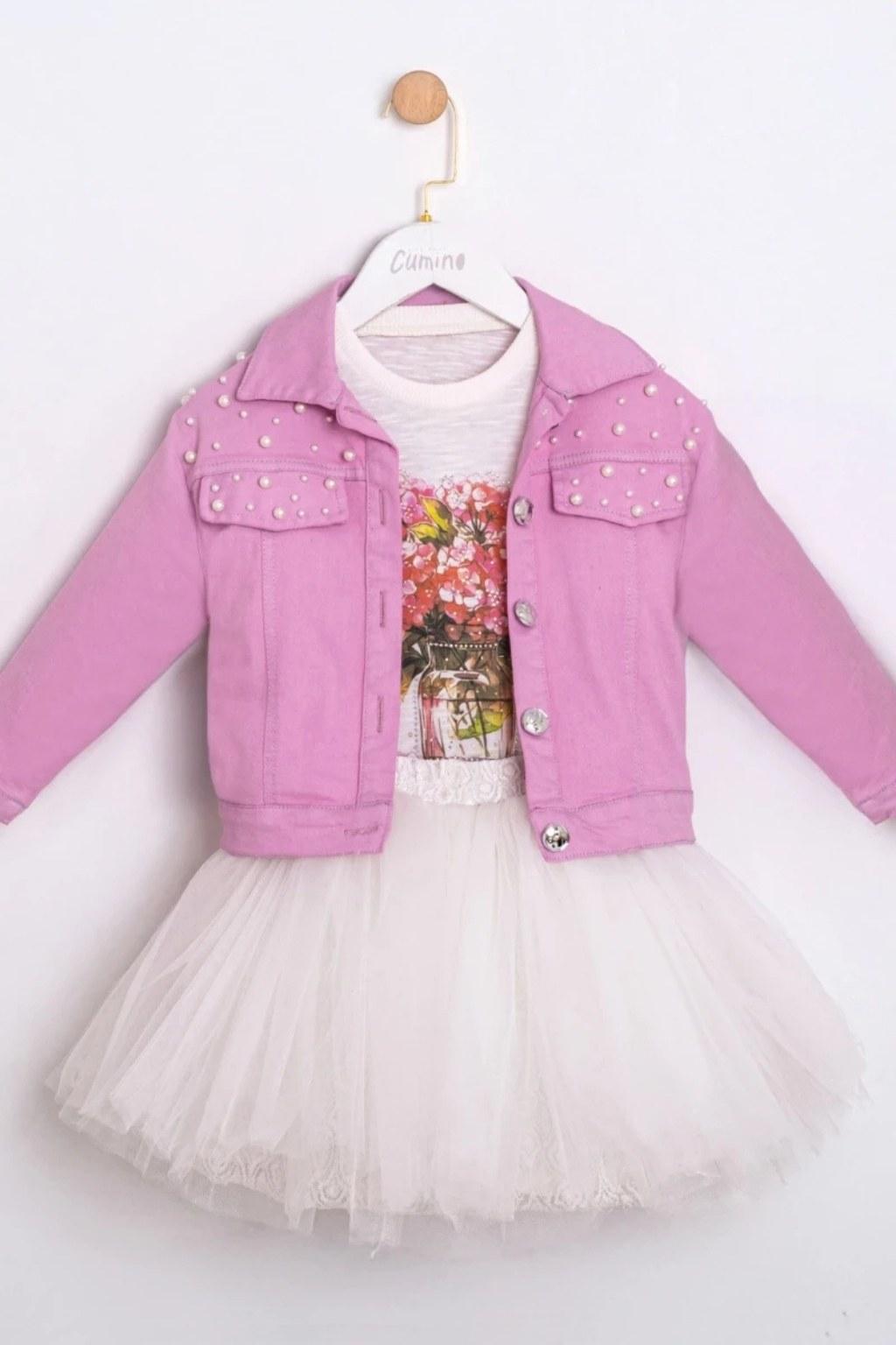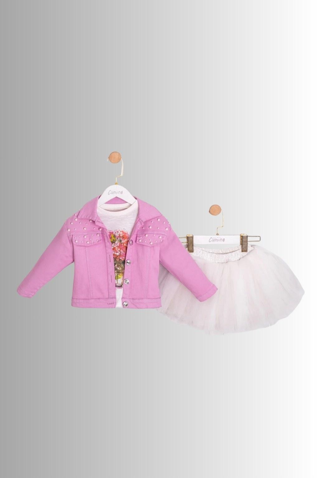 Miniklere hem şık hem rahat bir kombin: tütü etek, desenli tişört ve kot ceket aynı sette. Günlük kullanımda da doğum günü/özel gün kombinlerinde de çok tatlı durur. 2-3-4-5 yaş seçenekleriyle.