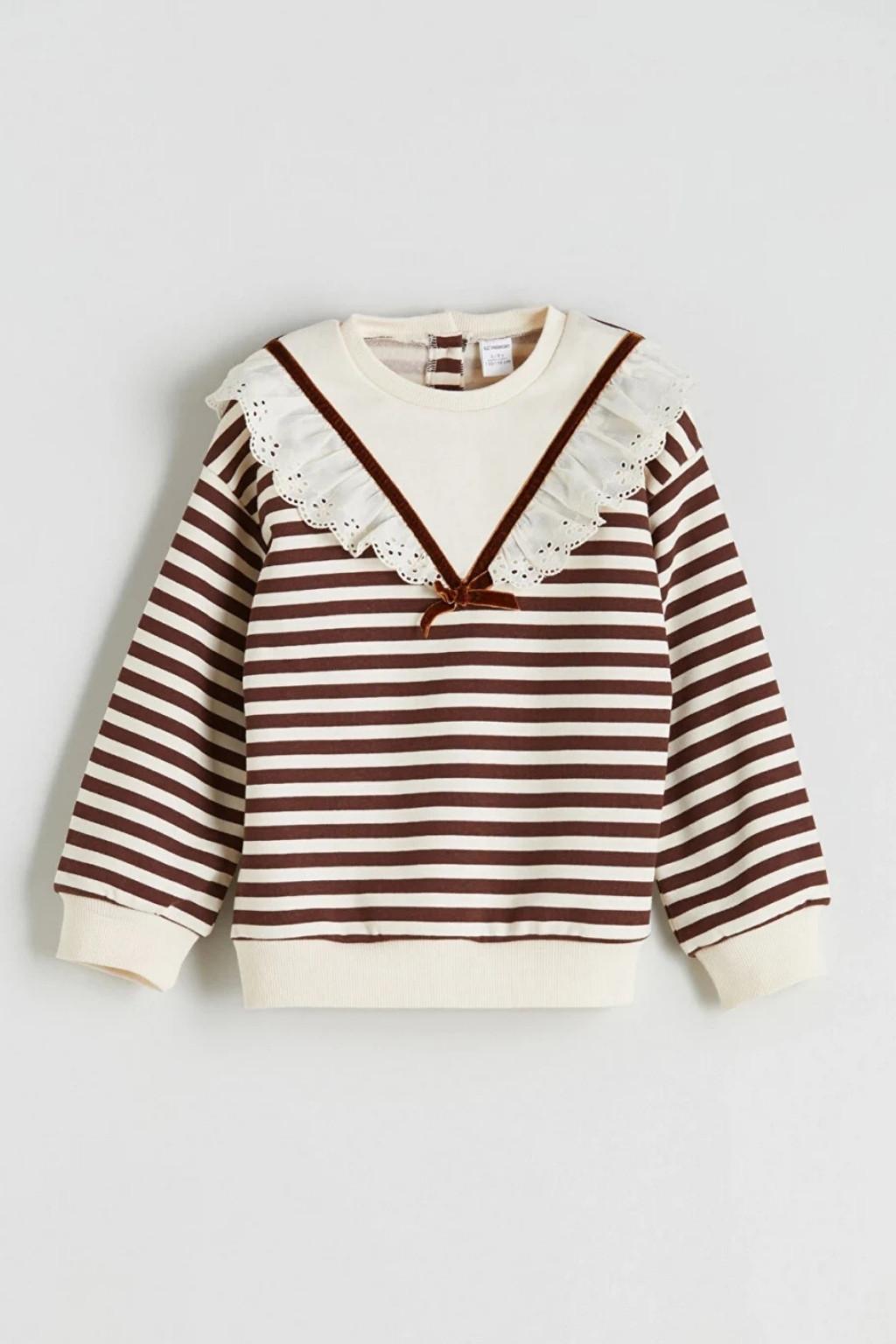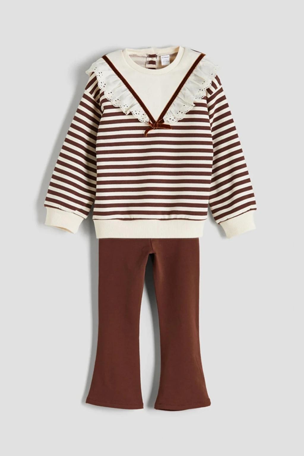 Şık ve rahat tasarımıyla günlük kombinlerin favorisi olacak 2’li kız çocuk takımı. Çizgili, dantel ve fiyonk detaylı üst ile bordo rahat kesim pantolon kombinlenmiştir. Hem günlük kullanım hem de özel günler için ideal bir modeldir.