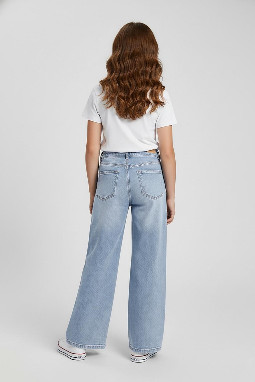 Modern ve rahat tasarımıyla öne çıkan kız çocuk geniş paça kot pantolon, günlük kombinler için hem şık hem de konforlu bir seçenektir. Açık mavi denim rengi sayesinde birçok farklı üst giyim ürünüyle kolayca kombinlenebilir.