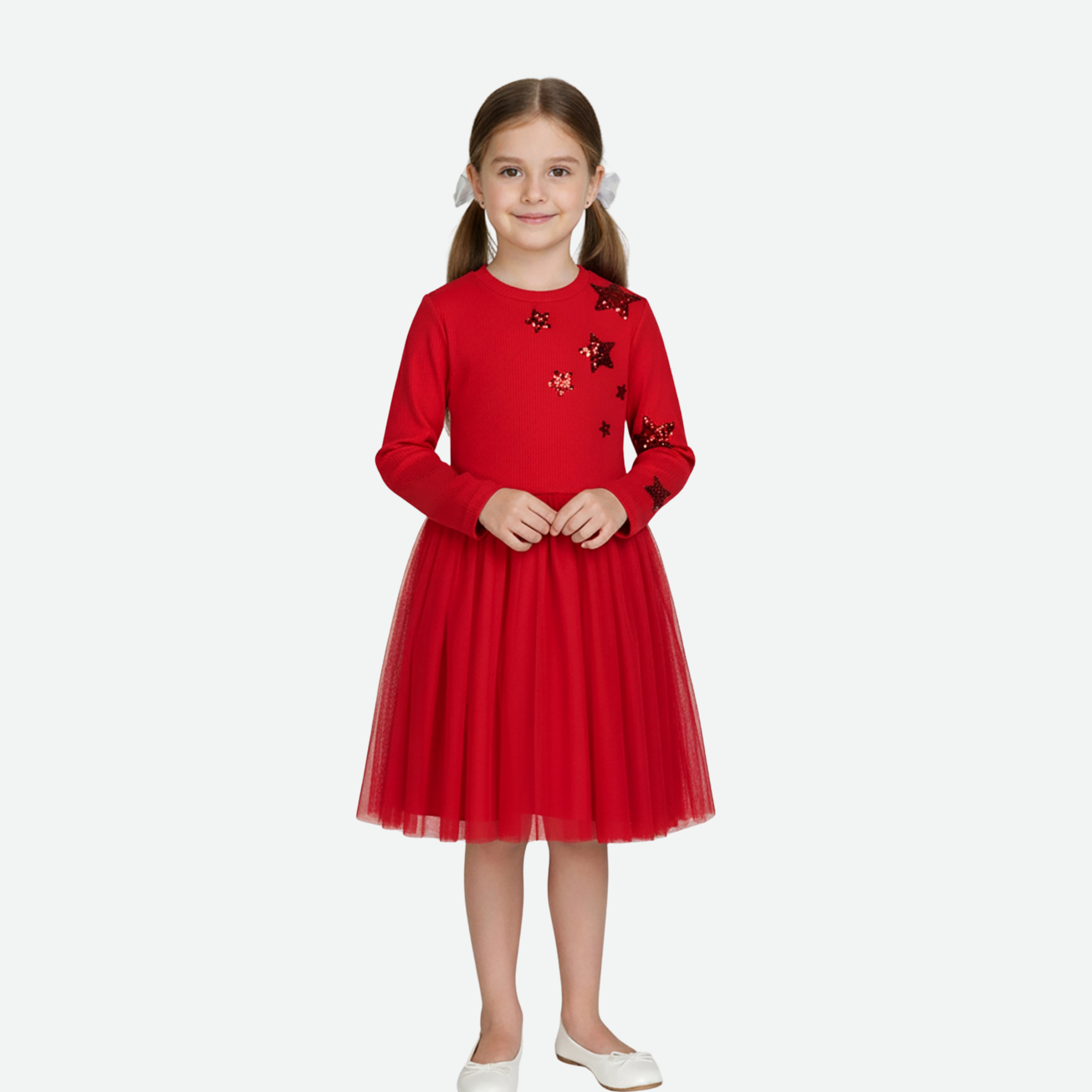 Kız Çocuk Yıldız Desen Kırmızı Elbise